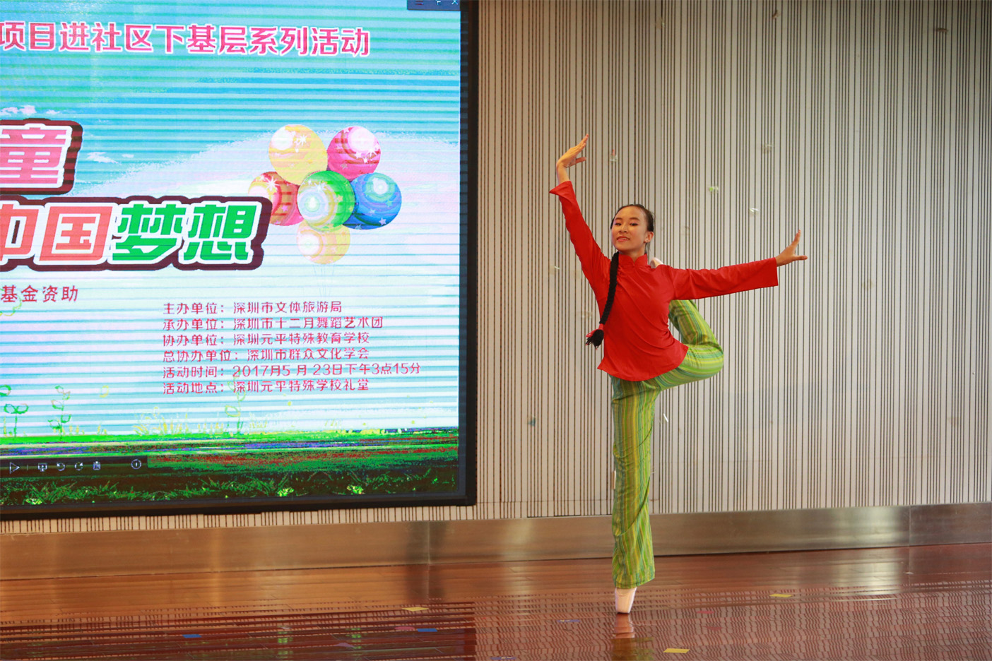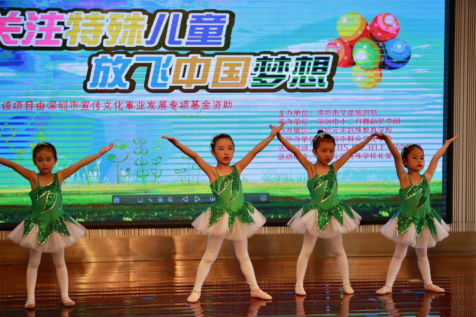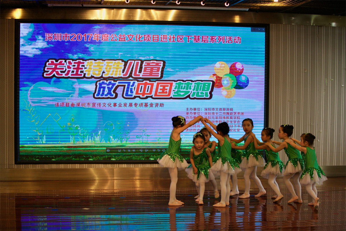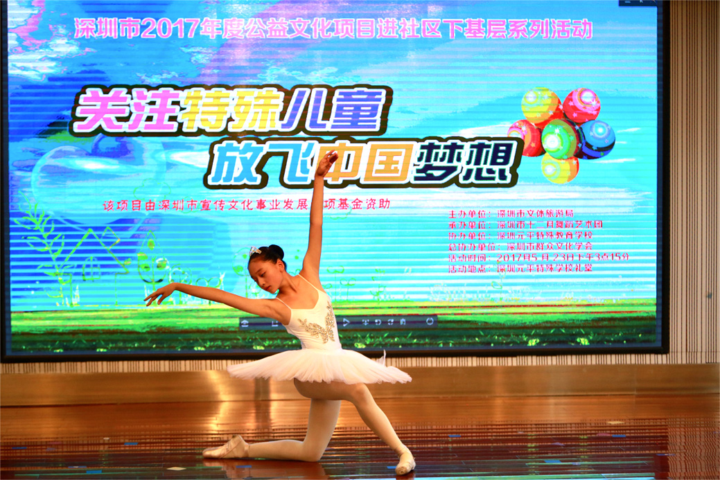 5月23日下午,深圳市十二月舞蹈艺术团连续第四年来到深圳元平特殊教育学校,为这儿的孩子们带来一场歌舞综合演出。此次演出的初衷是高雅艺术进学校,希望能够为元平师生带来真正高品质的高雅艺术表演。不仅有少儿芭蕾舞团的演员,还有十二月青年舞蹈团的主力演员参演,保证演出的高水准。参加演出的最小演员年仅四岁,这也展示出十二月倡导的“素质教育要从娃娃抓起”的教育理念。